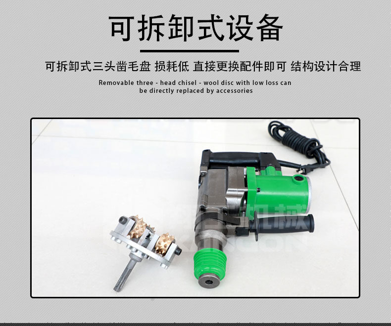 電動手持式鑿毛機(jī) 金剛石三頭鑿毛設(shè)備 小型水泥路面拉毛機(jī)。該鑿毛機(jī)型主要應(yīng)用于高鐵、高速公路橋面、隧道、水利水電、核電、市政道橋、大型集裝箱場地、停車場、室內(nèi)外混凝土地面翻新除險(xiǎn)加固等混凝土面層鑿毛工程