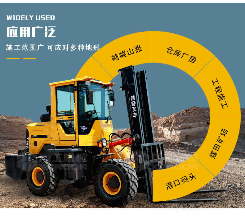越野叉車(chē)適用于道路修筑、城市建設(shè)、環(huán)境衛(wèi)生、石料場(chǎng)、中小型土木工程、車(chē)站、碼頭、貨場(chǎng)、倉(cāng)庫(kù)等地方,主要用來(lái)轉(zhuǎn)運(yùn)石料、設(shè)備、貨物、城市垃圾箱以及集裝物料等。