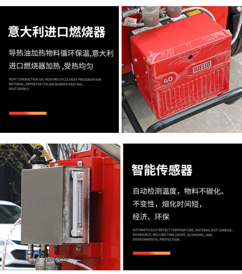 灌縫機(jī)主要有手推式和自行式手持灌縫管操作,采用進(jìn)口柴油燃燒器加熱。在工作時(shí)首先在料箱內(nèi)加入瀝青或灌縫膠,啟動(dòng)發(fā)電機(jī)供電,依次間斷打開導(dǎo)熱油泵開關(guān),燃燒器開關(guān),出料管加熱開關(guān);