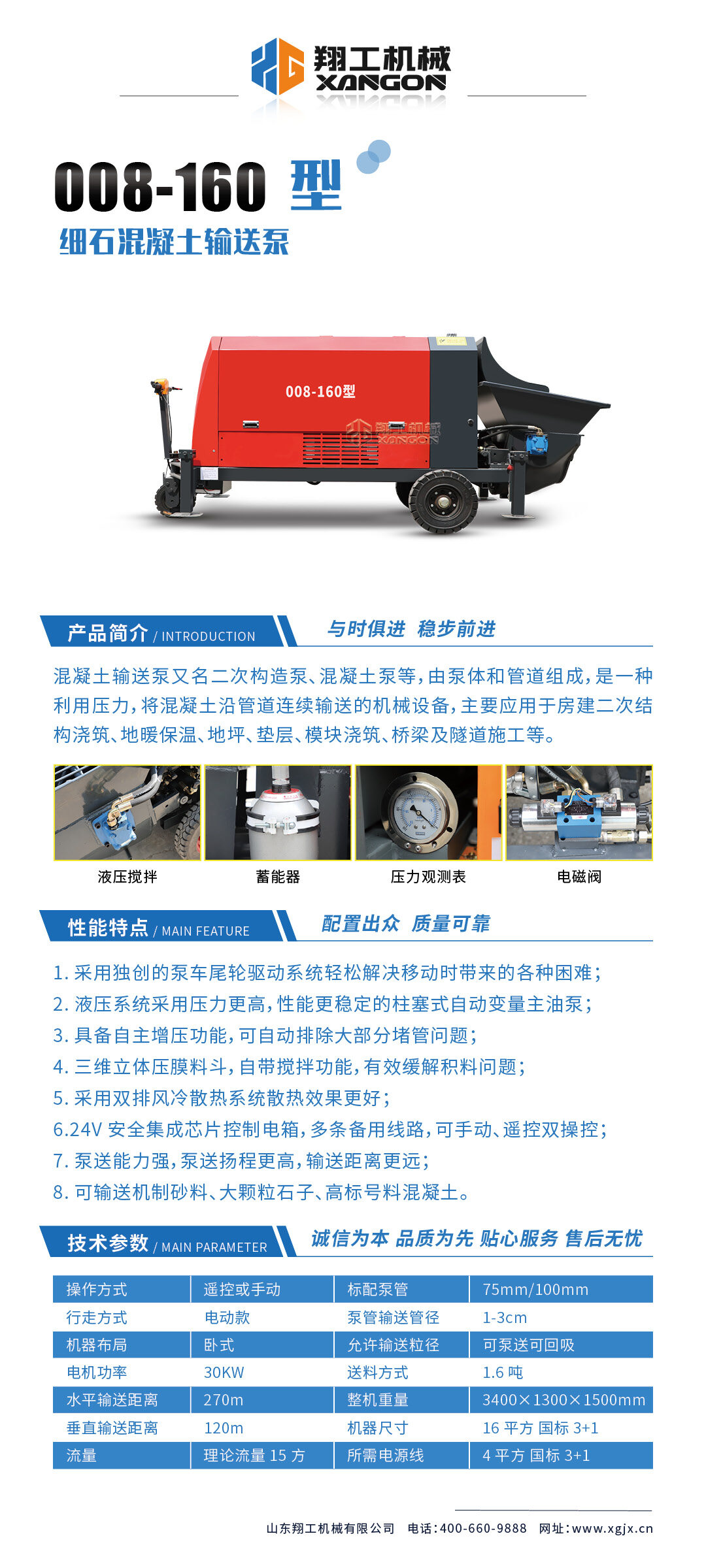 采用獨(dú)創(chuàng)的泵車尾輪驅(qū)動系統(tǒng)輕松解決移動時(shí)帶來的各種困難,采用雙排風(fēng)冷散熱系統(tǒng)散熱效果更好,液壓系統(tǒng)采用壓力更高,性能更穩(wěn)定的柱塞式自動變量主油泵,采用先進(jìn)的三維立體壓模一體式自動攪拌料斗可輸送機(jī)制砂,高標(biāo)號混凝土,有效緩解積料問題。