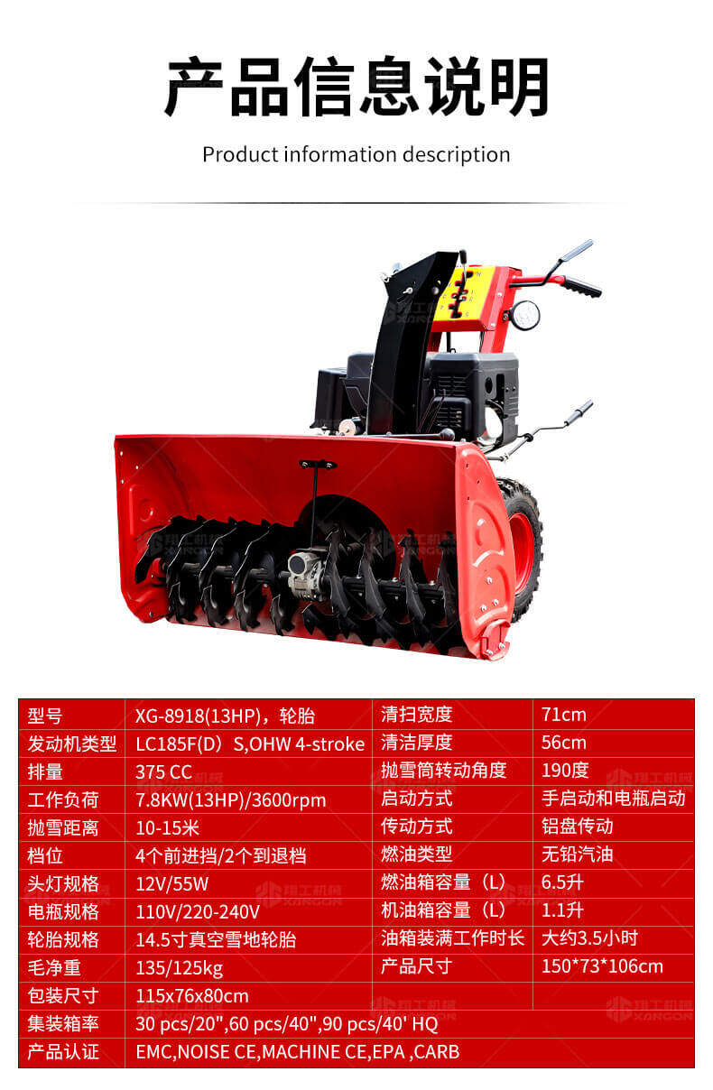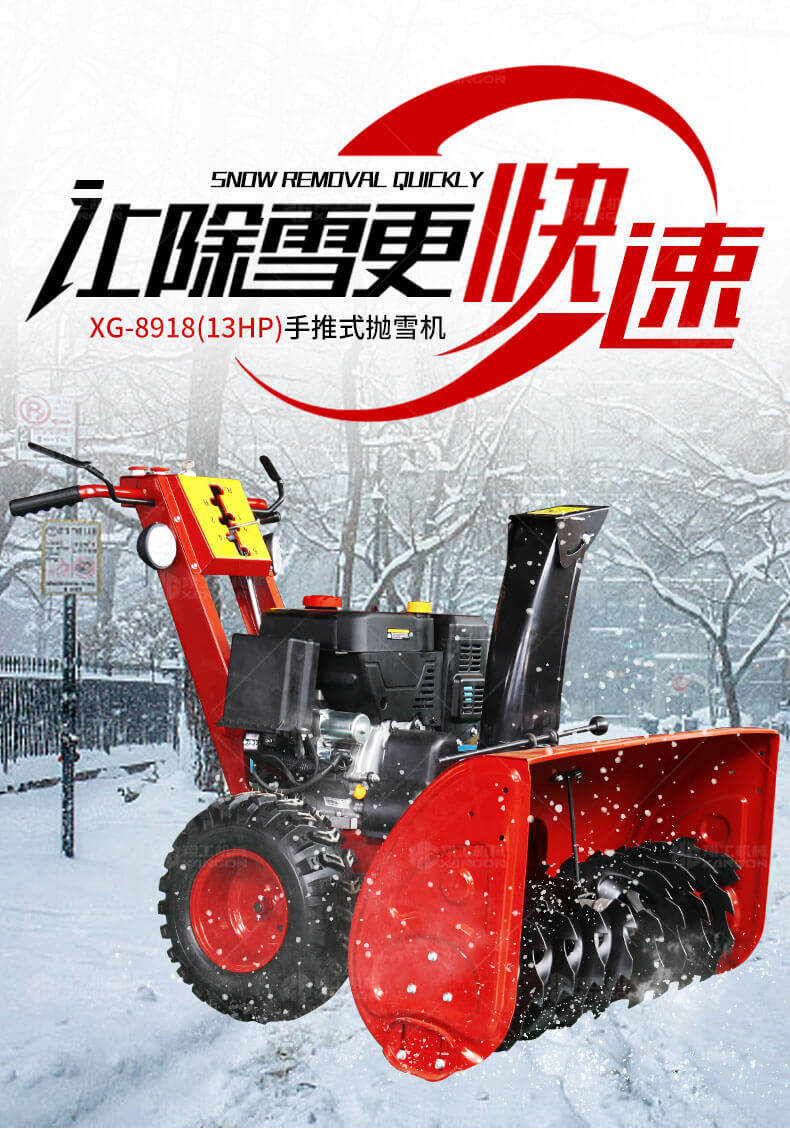 XG-8918(13HP)手推式拋雪機(jī)是一款地面拋雪機(jī),路面拋雪機(jī),道路拋雪機(jī)。這款拋雪機(jī)采用LC185F(D)S,OHW 4-stroke發(fā)動(dòng)機(jī),強(qiáng)勁有力。葉片高速旋轉(zhuǎn)將雪旋進(jìn)掃雪車?yán)?,再通過(guò)導(dǎo)管運(yùn)到儲(chǔ)雪箱中。其特點(diǎn)是:采用大功率主機(jī),寬幅、卓效,使用較廣。