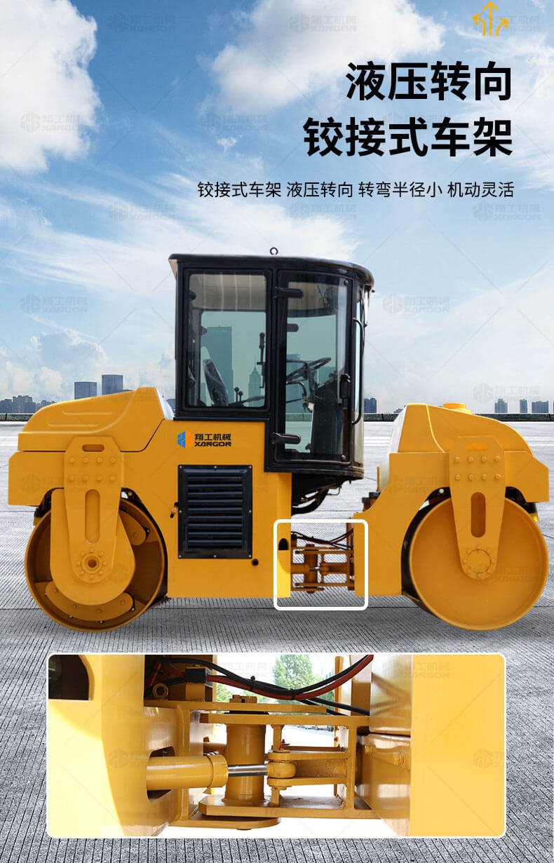 XGC6型振動(dòng)壓路機(jī)(SAC6CD型振蕩壓路機(jī))是一種串聯(lián)式的雙鋼輪型振動(dòng)(蕩)壓實(shí)機(jī)械;該機(jī)主要由鉸接式車架、振動(dòng)(蕩)輪、轉(zhuǎn)向輪,動(dòng)力裝置、液壓振動(dòng)、液壓轉(zhuǎn)向、操縱機(jī)構(gòu)、電動(dòng)灑水和電氣系統(tǒng)等主要部分組成。