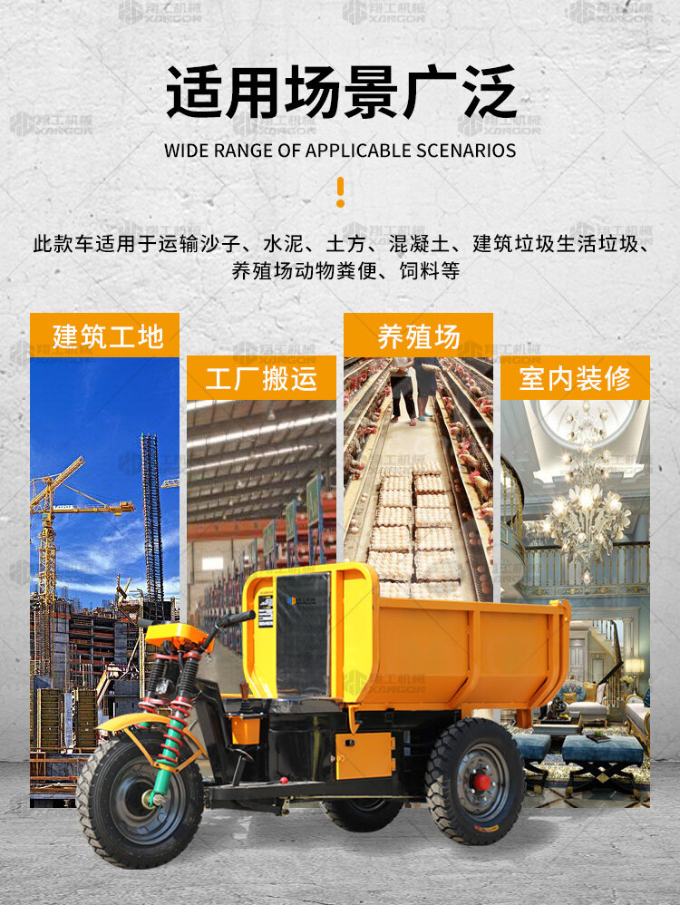 此款車適用于建筑工地、室內(nèi)裝修、養(yǎng)殖場、工廠等場所,運輸沙子、水泥、土方、混凝土、建筑垃圾生活垃圾、養(yǎng)殖場動物糞便、飼料等,體積小操作簡單靈活,可原地360度轉(zhuǎn)圈,可進入樓層、樓道、電梯、吊籃等各種狹小空間作業(yè),是您必不可少的裝卸助手。