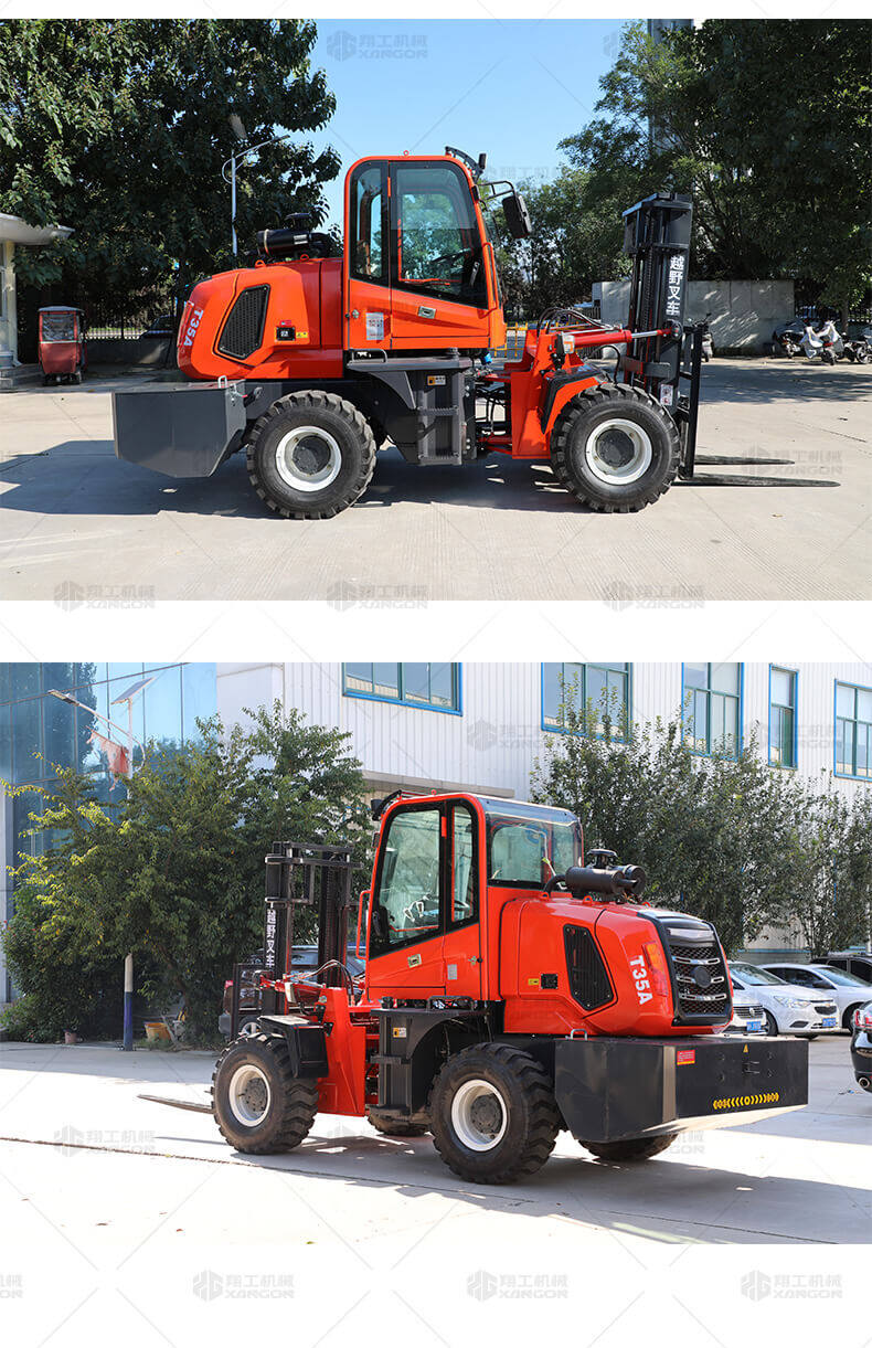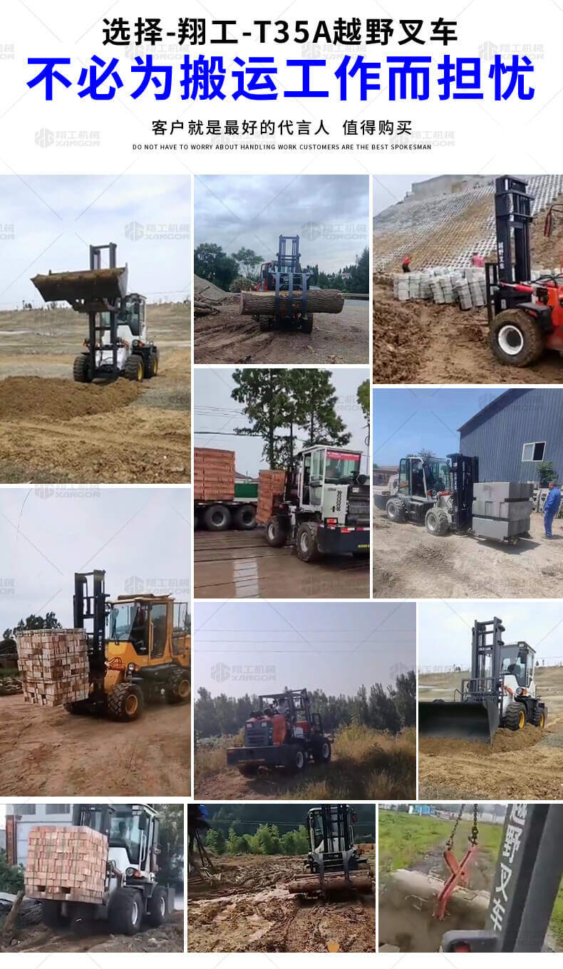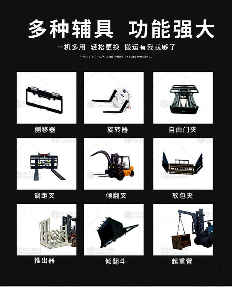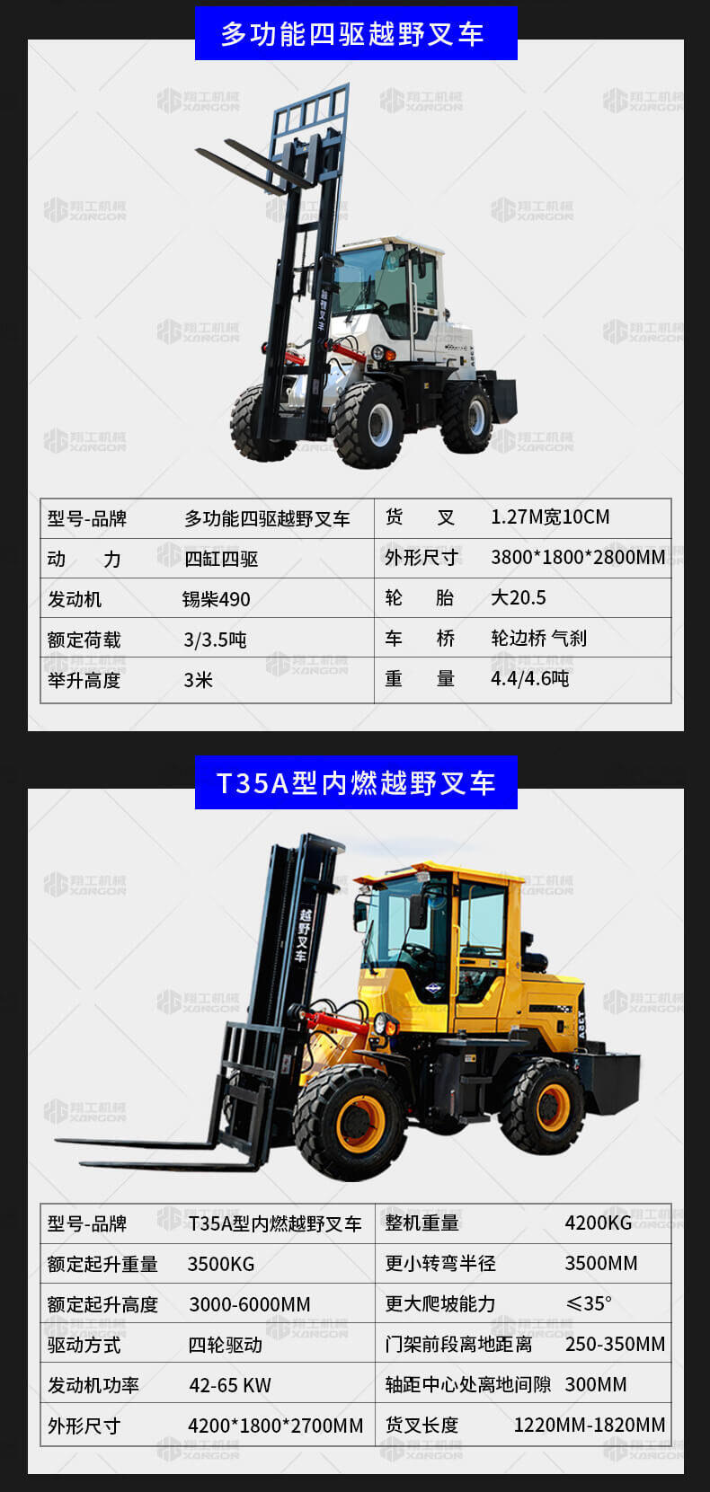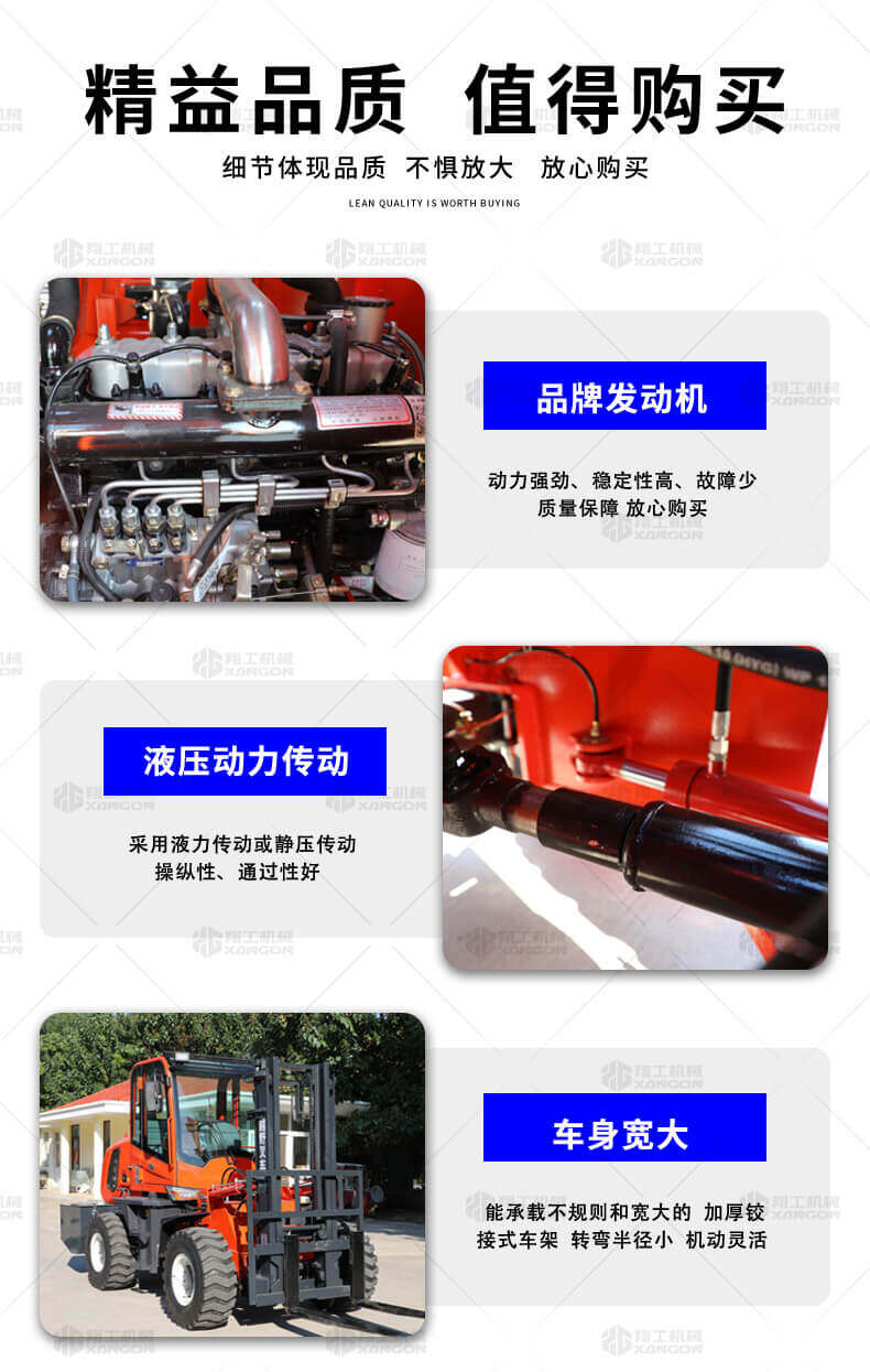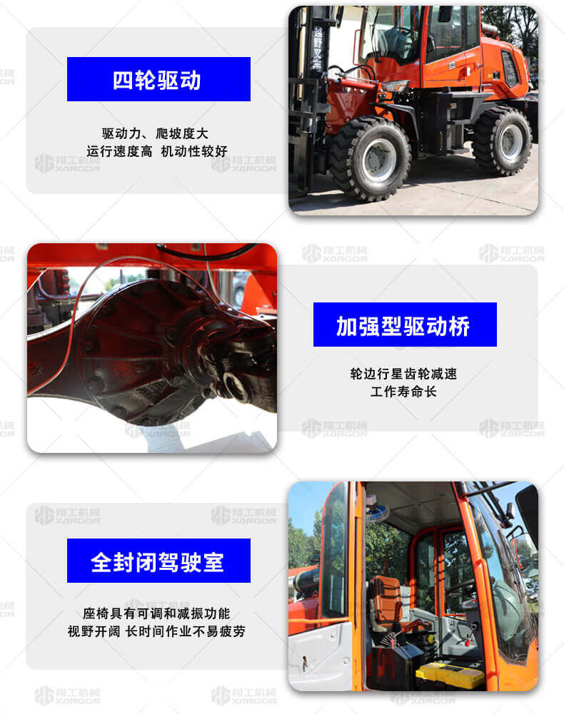 越野叉車可以在坡地和不平地面上進(jìn)行貨物裝、卸、堆垛及搬運(yùn)作業(yè),具有良好的機(jī)動性、越野性可靠性。其功能多樣,可搭配側(cè)移器、調(diào)距叉、旋轉(zhuǎn)器、軟包夾、推出器、側(cè)翻叉、側(cè)翻斗、起重臂等工具完成不同的工作。