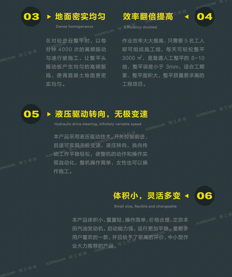 3,本產(chǎn)品能一次性鋪設(shè)混凝土基層,將其抹平將其震蕩光滑,您的工作速度將大大提高,因?yàn)樵摍C(jī)器自動(dòng)設(shè)定標(biāo)高,使得操作員快速的通過(guò)工作區(qū)域;