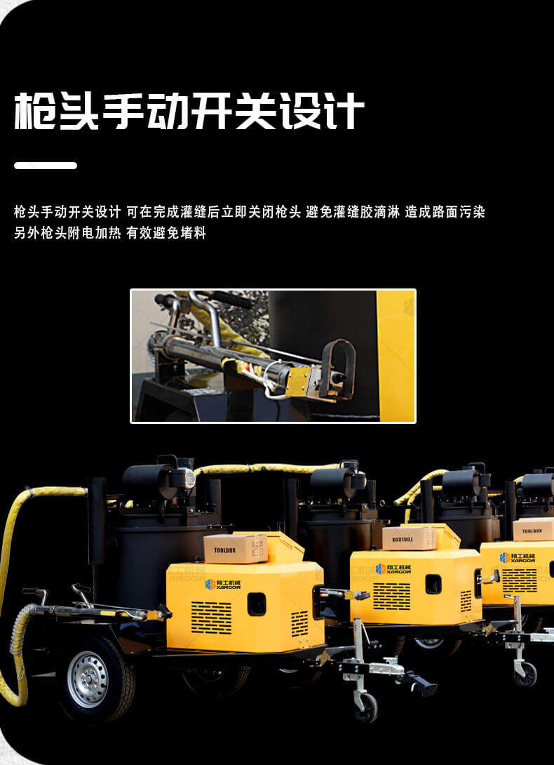XGF-200瀝青灌縫機使用原料為瀝青灌縫膠,主要用于瀝青路面不規(guī)則裂縫、混凝土路面、橋梁伸縮縫、上下水道、煤氣管埋設機鋪裝路面的連結處防水處理,是翔工機械專門設計、生產的瀝青補灌縫機械。